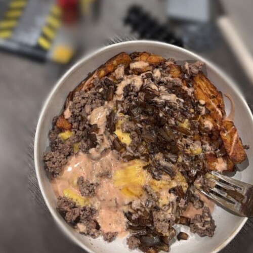 - Assemble the BowlLayer sweet potatoes, ground beef, cheese, and caramelized onions in a bowl. Drizzle generously with the burger sauce and enjoy warm.
